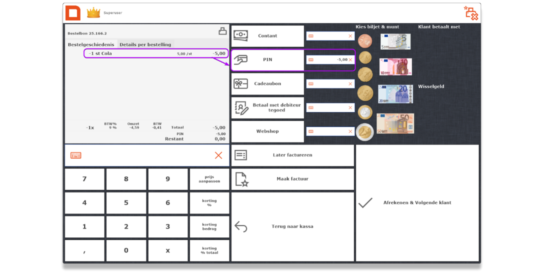 Dann können Sie keinen Rückgabe-Pin verwenden, da es sich nicht um eine elektronische Transaktion handelt. In diesem Fall geben Sie den Betrag in bar oder über eine von Ihnen akzeptierte Zahlungsmethode zurück.